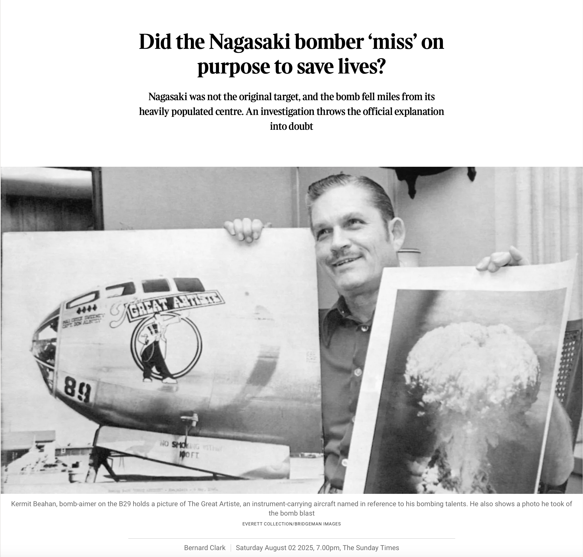 The key facts are incontrovertible. After three runs across the primary target through a clear sky over Kokura, Beahan did not drop the bomb. Had he done so, at least three hundred thousand people would have been killed. When they reached the secondary target, Nagasaki, in spite of now being authorised to drop using radar, making a bullseye simple, he chose to drop Fat Man on a hill two miles short, so the massive blast largely flew over the city. Instead of an estimated one-hundred-thousand-plus being killed, six months later the toll was only thirty-eight thousand.